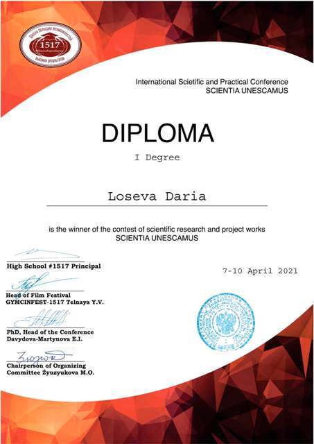 Лосева Дарья, победитель международной научно-практической конференции "Объединяемся знаниями"